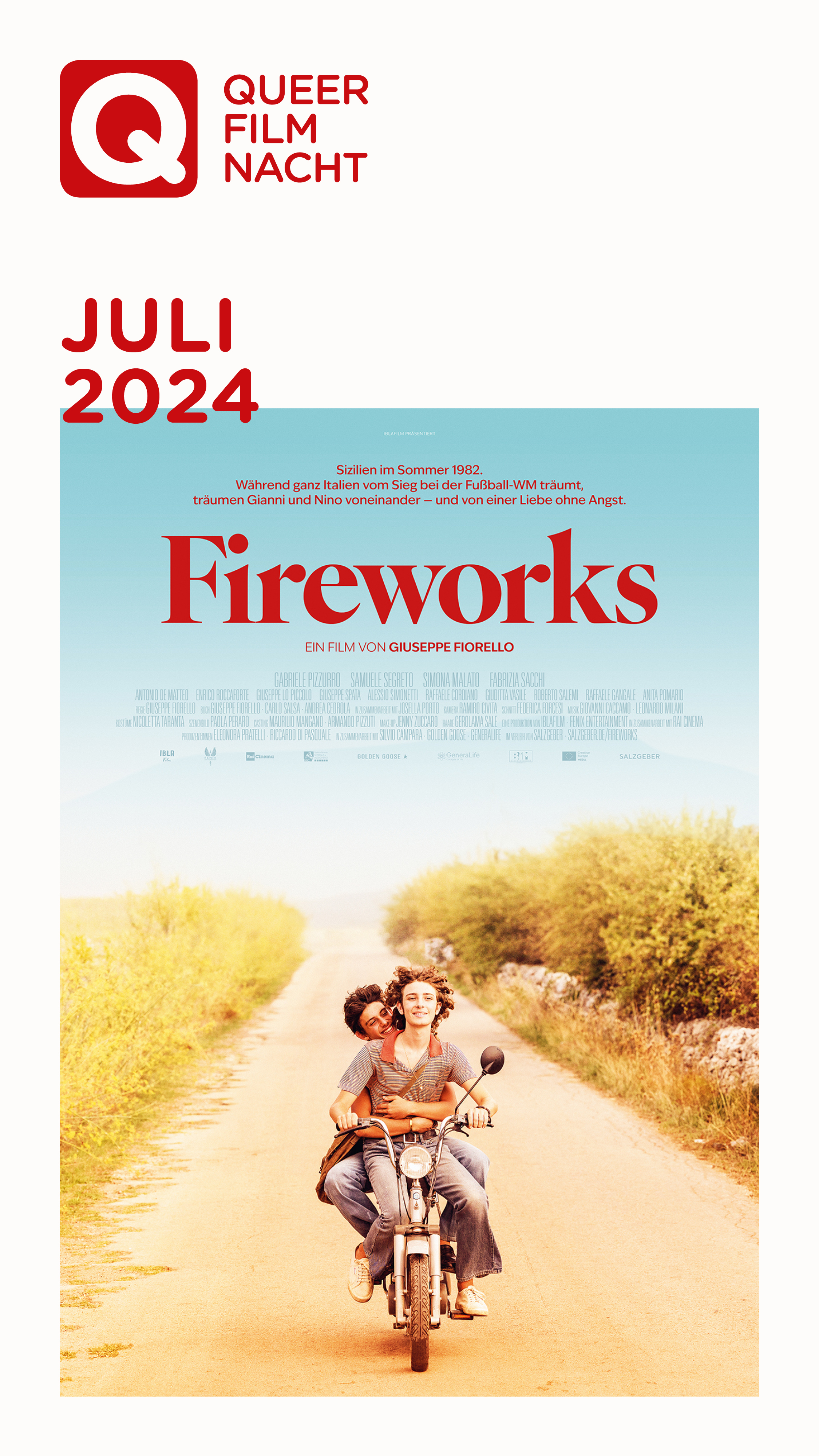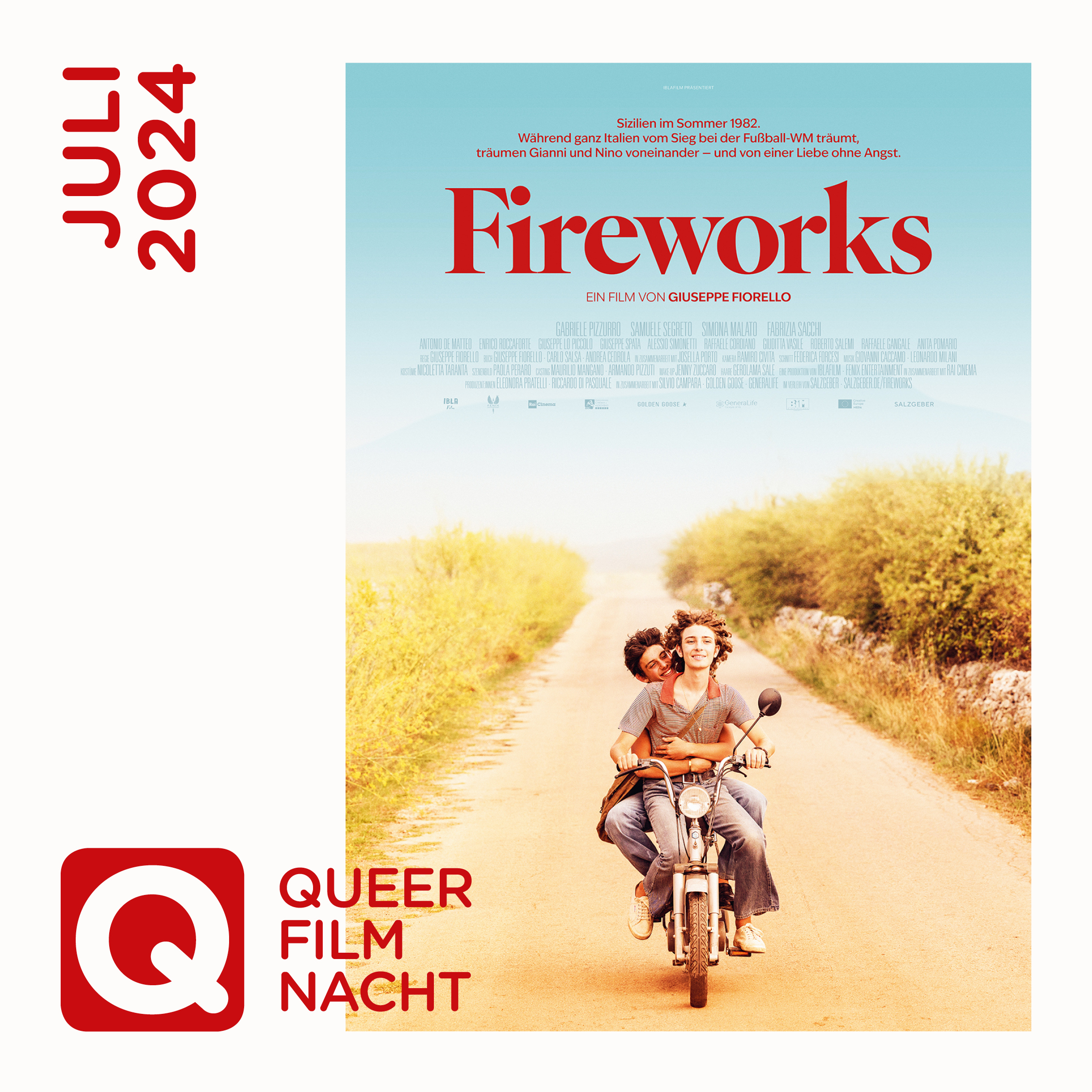 „Fireworks“ basiert auf einer wahren Kriminalgeschichte, dem sogenannten „Delitto di Giarre“, das Anfang der 1980er Jahre zur Gründung von „Arcigay – Associazione LGBTI+ italiana“ geführt hat, dem bis heute wichtigsten Verband für queere Bürger:innenrechte in Italien. Getragen von seinen zwei fabelhaften Hauptdarstellern und unterlegt von der herzzerreißenden Musik des sizilianischen Sängers Franco Battiato, zeichnet der Film von Giuseppe Fiorello ein authentisches Porträt der höchst problematischen Lebenssituation von Schwulen im italienischen Süden nicht nur jener Jahre. In Italien wurde das mitreißende Liebesdrama u.a. mit den Globo d’oro für den Besten Debütfilm ausgezeichnet. Jetzt leuchtet „Fireworks“ auch auf den deutschen Leinwänden.